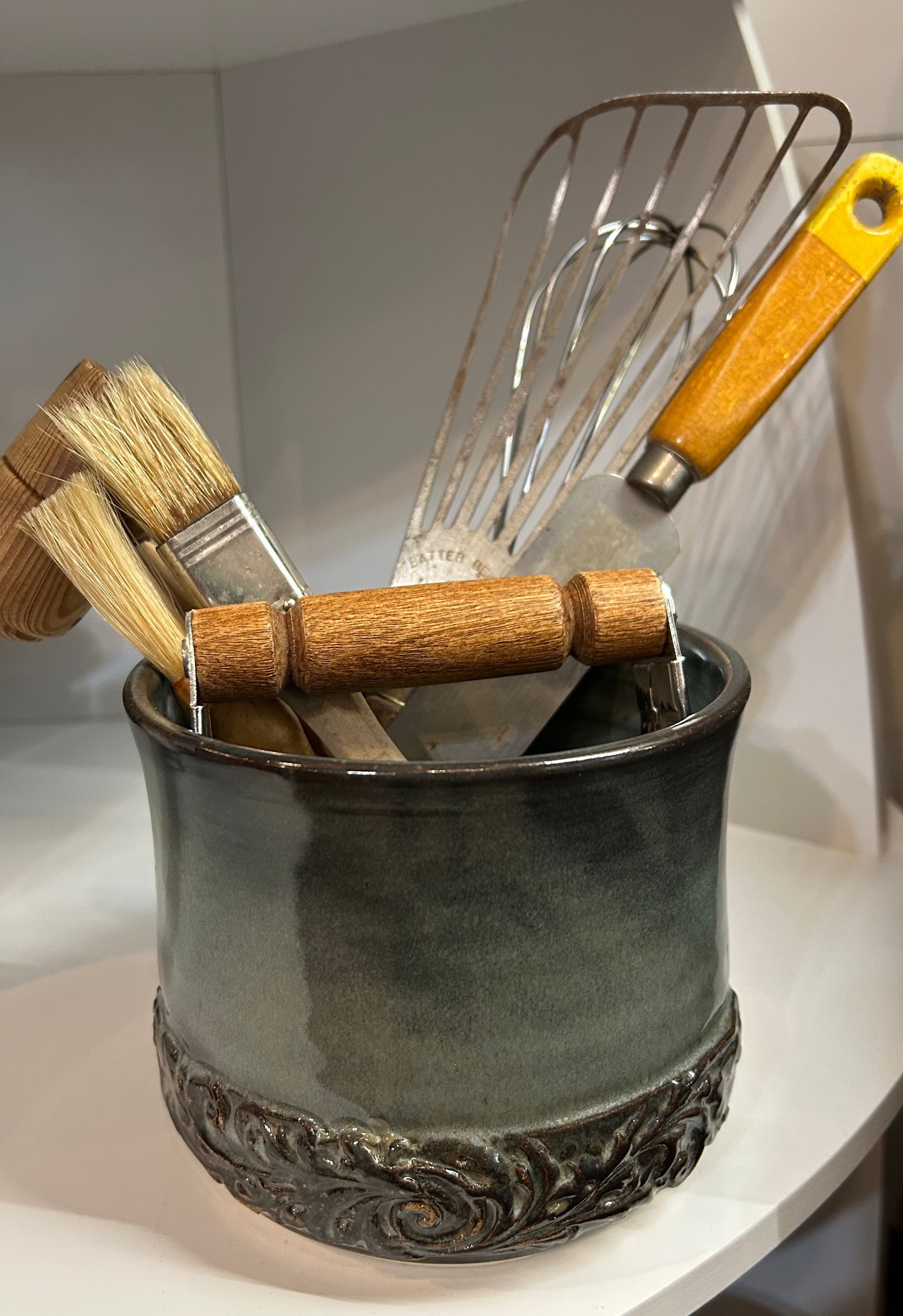 You never know what hues or drips on our Gatton floating blue pottery will turn out after it comes out of the firing. Unique and hand crafted local, we always love how the break in the kiln gives some of these pieces a brown tarnish look.